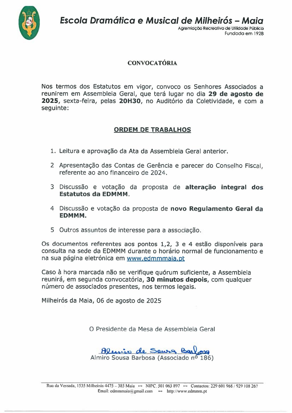 Fundada em 1928 como associação cultural e recreativa, a Escola Dramática e Musical de Milheirós Maia é uma pessoa coletiva de direito privado e utilidade pública, sem fins lucrativos, dotada de personalidade jurídica com duração indeterminada.